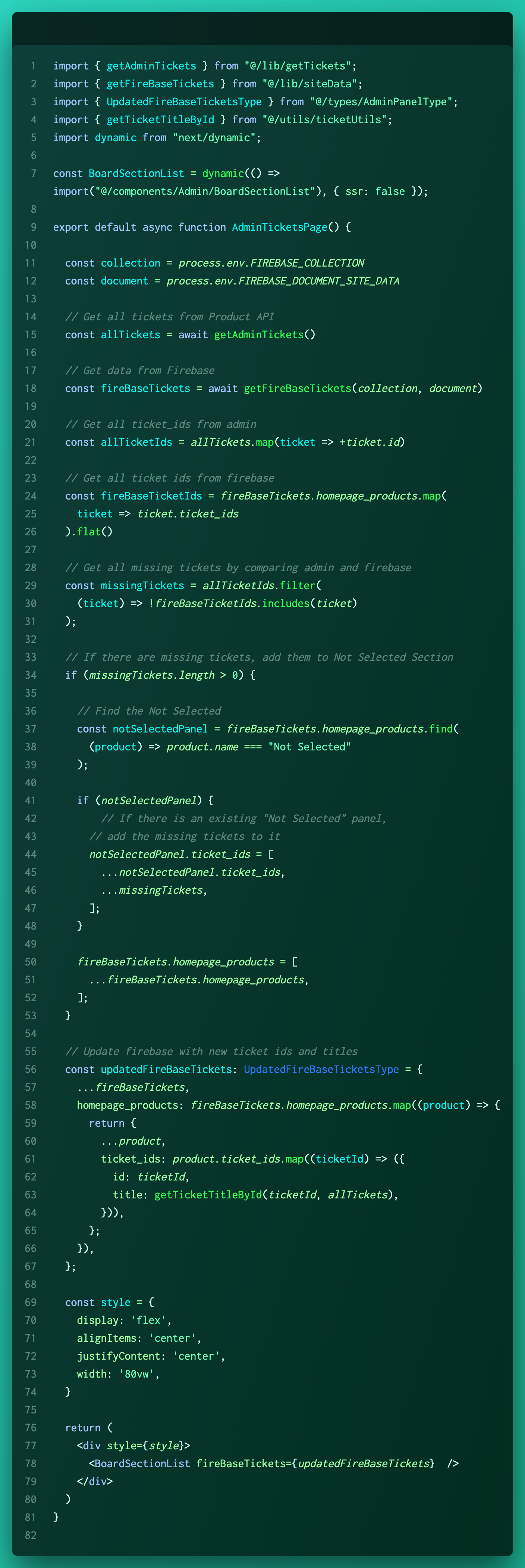 The Admin Panel is a key feature of the application, allowing back office staff to manage ticket sections. The data for the Admin Page is constructed via a server component. Due to its dependency on the react-beautiful-dnd package, which only functions on the client side, the BoardSection component is imported dynamically with the default server-side rendering set to false. This setup ensures smooth and efficient operation of the Admin Panel, while maintaining compatibility with client-side packages.